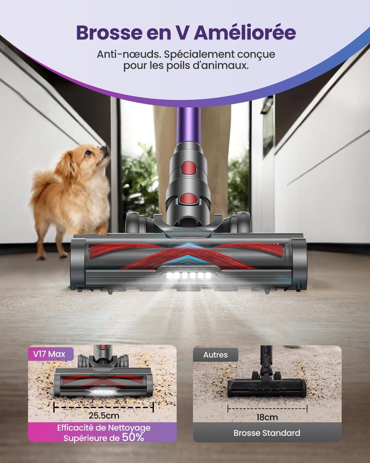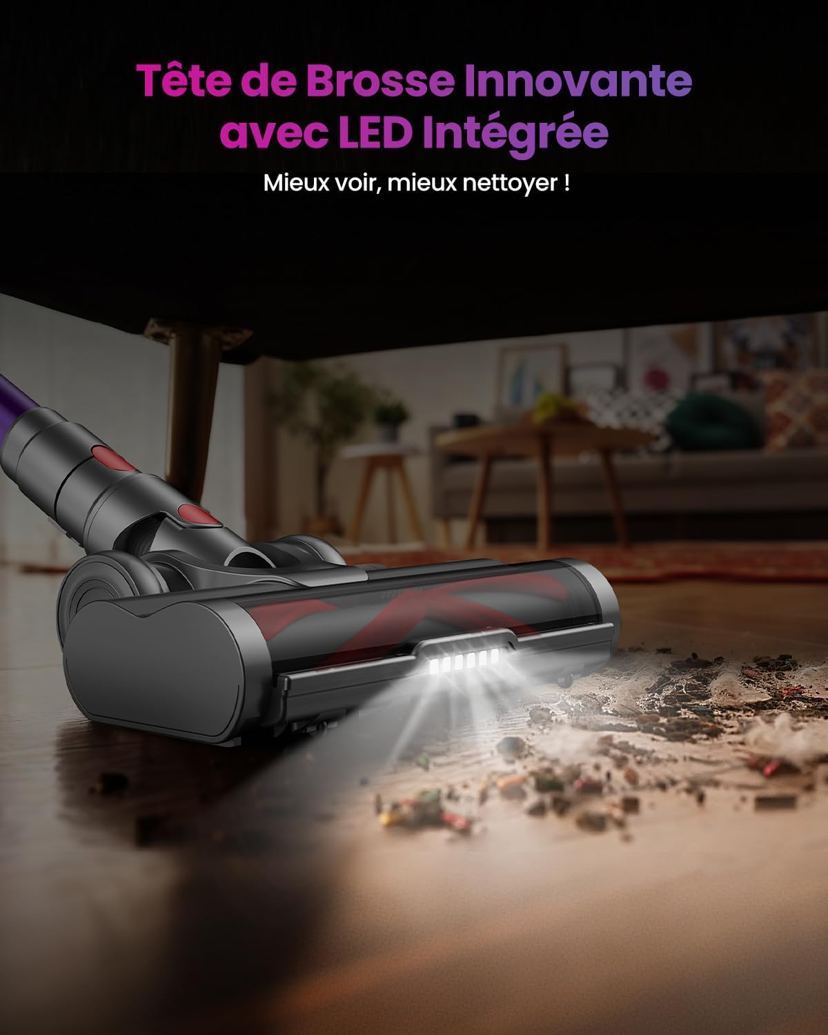 Notre aspirateur balai sans fil équipé d’une brosse anti-enchevêtrement intègre une structure en V, une réduction des nœuds, une fluidité de rotation, une large surface de contact et une mobilité directionnelle optimisée. Ce système limite l’accumulation de cheveux et de poils, facilitant l’entretien de la brosse. La tête pivotante améliore l’accès aux angles et zones moins visibles, complétée par un éclairage LED pour un repérage précis des poussières.