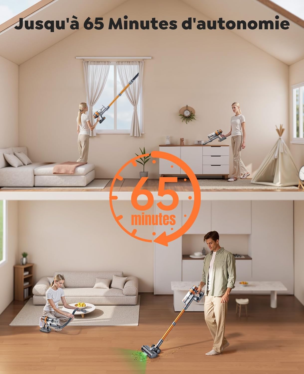 Équipé d’une batterie lithium haute capacité, notre aspirateur sans fil offre jusqu’à 65 minutes d’utilisation en mode ECO. La batterie amovible peut être remplacée facilement pour prolonger le nettoyage jusqu’à 130 minutes. Cette configuration vous permet de nettoyer maison et voiture sans vous soucier de la recharge, assurant ainsi un usage continu et pratique.