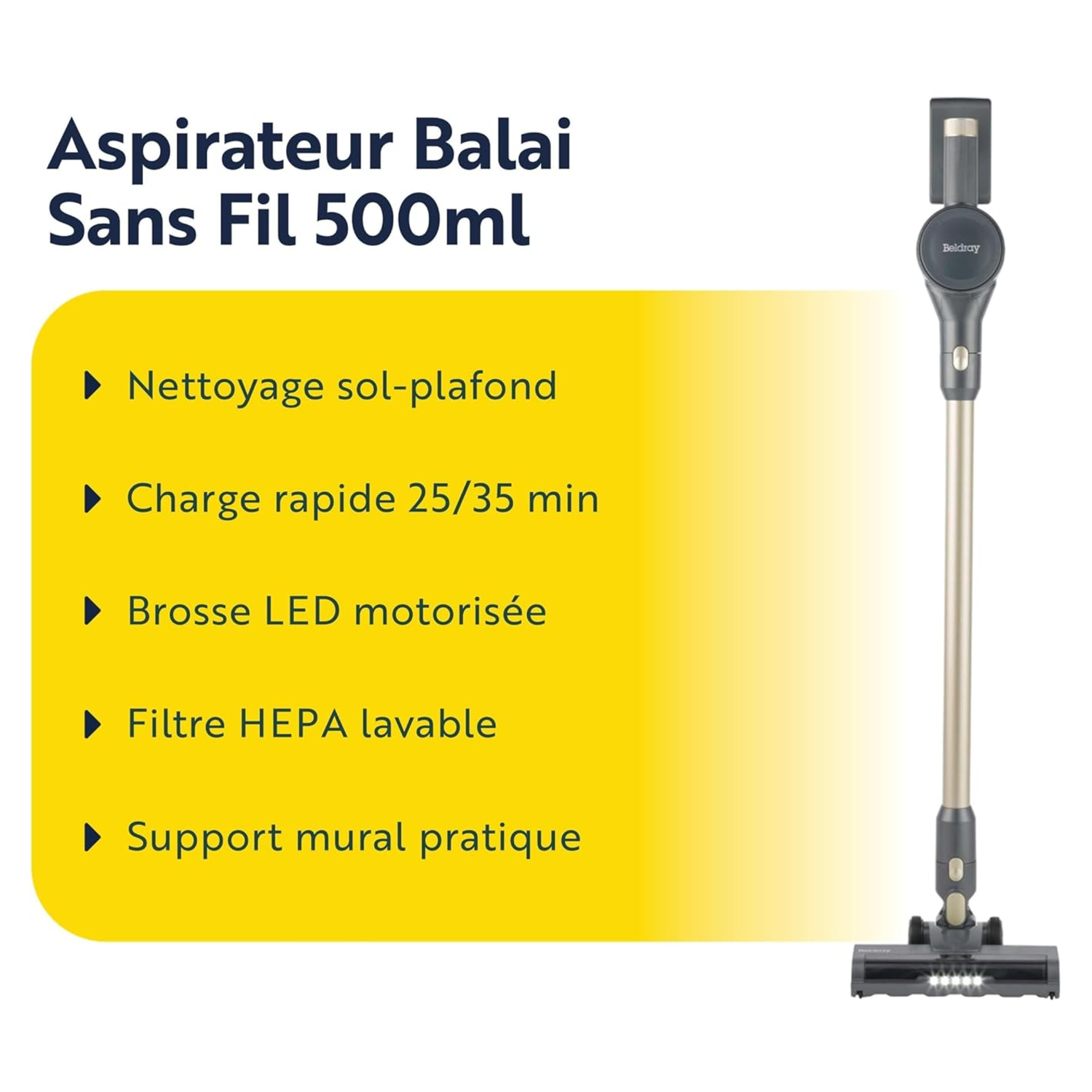 Avec son design étudié pour le confort d’utilisation, notre aspirateur balai sans fil ergonomique affiche un poids léger de 2,94 kg, favorisant une maniabilité optimale. Le support mural inclus permet un rangement vertical discret et un gain d’espace appréciable. Le bac à poussière de 0,5 L se vide facilement, assurant une utilisation rapide et sans contrainte au quotidien.