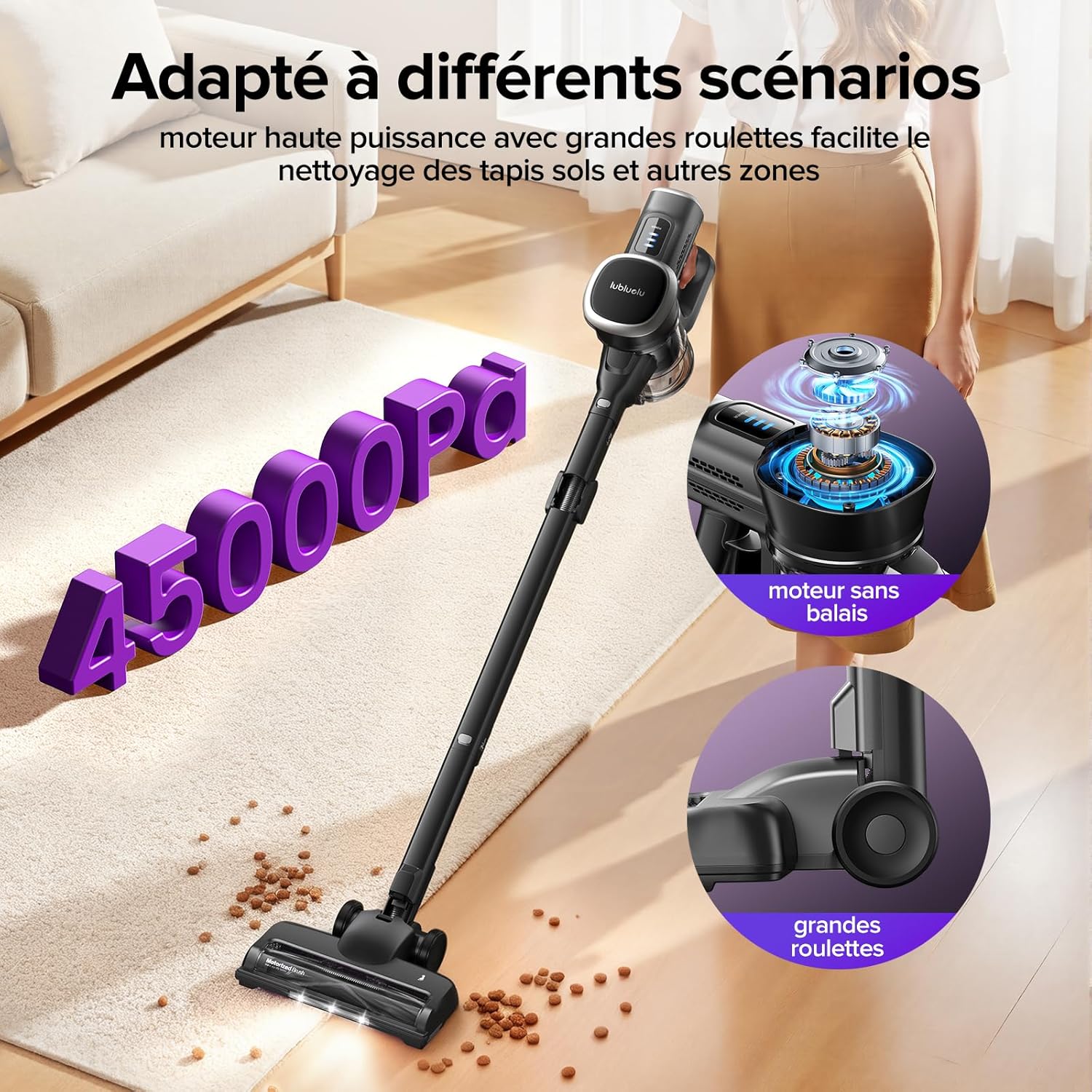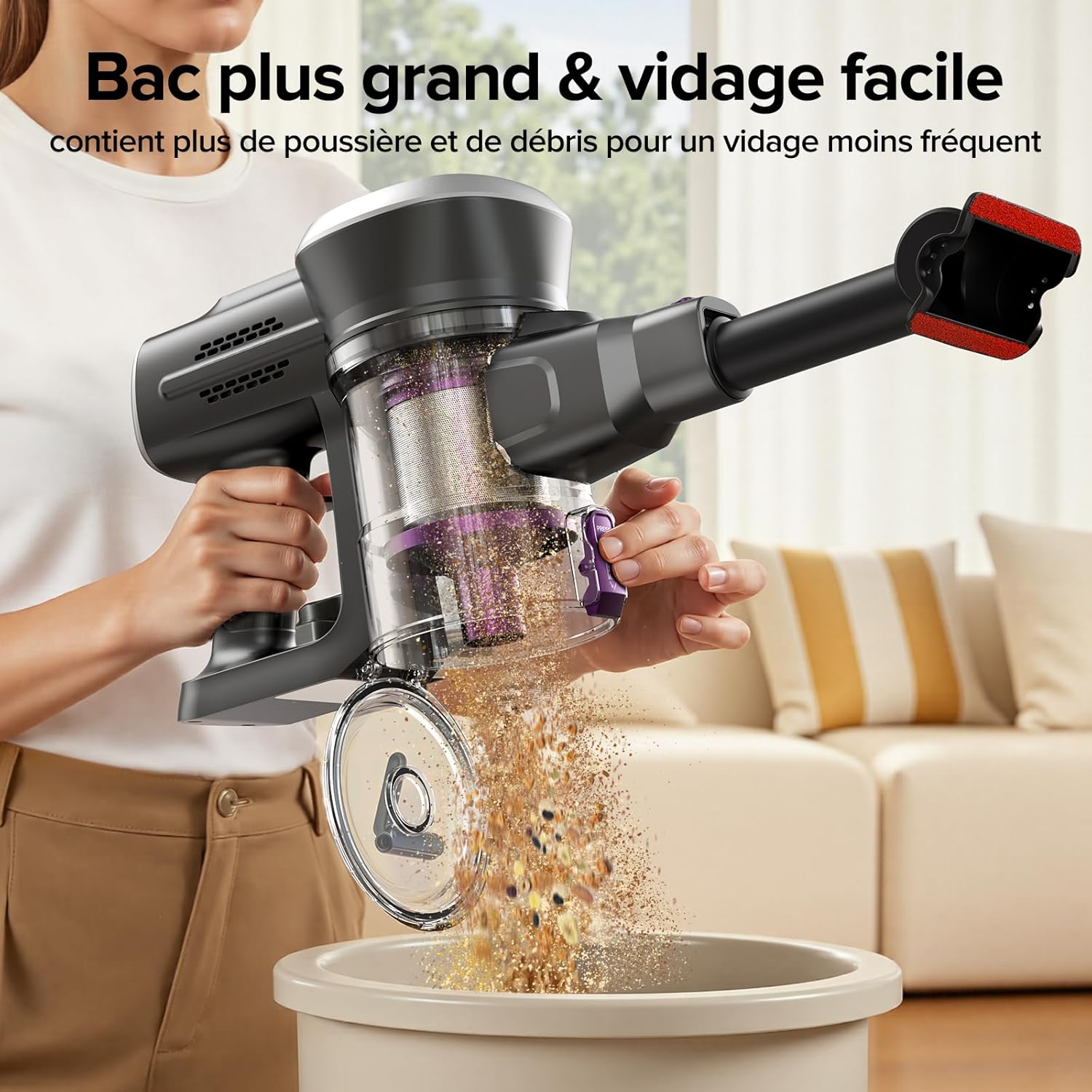 Notre appareil repose sur un moteur brushless, une puissance de 220 watts, une aspiration constante, une efficacité énergétique et une stabilité de performance. Cette configuration permet d’éliminer efficacement les poussières, débris et poils d’animaux sur différentes surfaces. Le fonctionnement du moteur assure une durabilité accrue et une régularité d’aspiration lors des sessions de nettoyage.