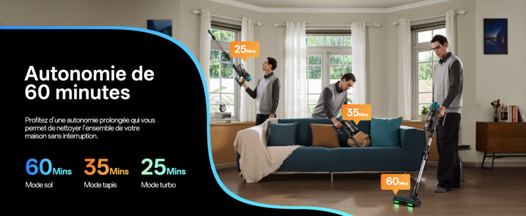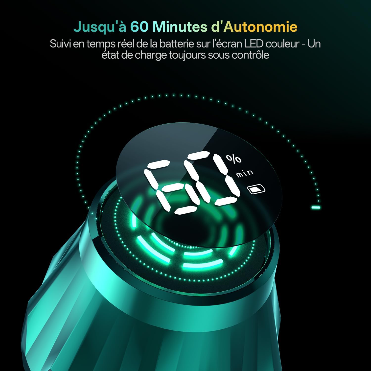 Notre solution intègre une batterie lithium-ion, une autonomie jusqu’à 60 minutes, une batterie amovible, un temps de charge de 5 heures et un fonctionnement sans fil. Cette configuration permet une utilisation prolongée sans contrainte de câble. Le remplacement de la batterie facilite l’extension de la durée d’utilisation, ce qui rend l’appareil adapté aux surfaces étendues et aux séances de nettoyage complètes.