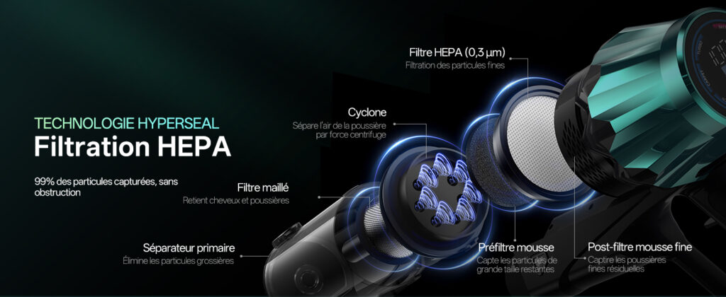 Notre équipement utilise un filtre HEPA, une filtration haute précision 99,9 %, un système à 7 cyclones, une séparation efficace poussière/air et une rétention des allergènes. Cette technologie limite l’encrassement du filtre tout en maintenant une aspiration constante. Les particules fines, la poussière et les poils sont capturés, contribuant à un environnement intérieur plus sain.