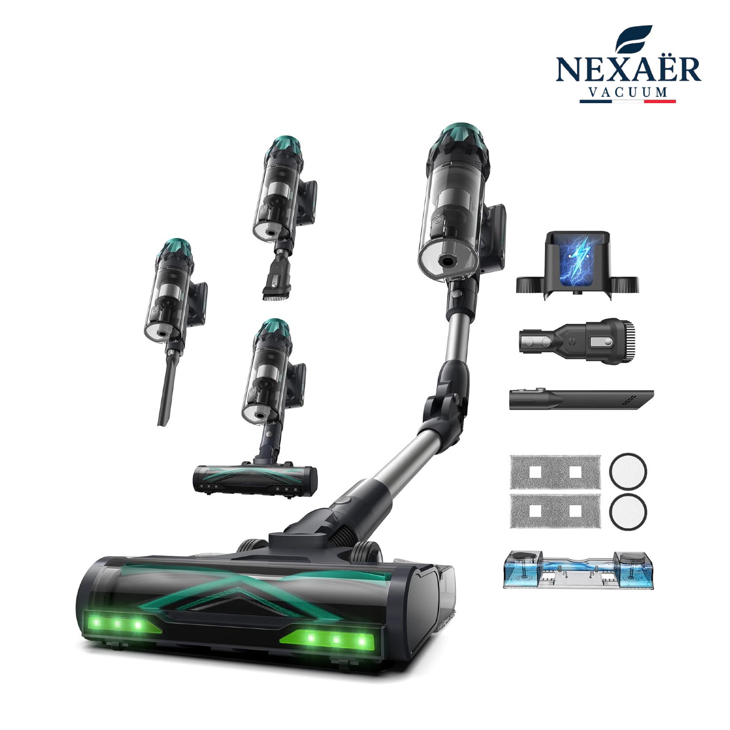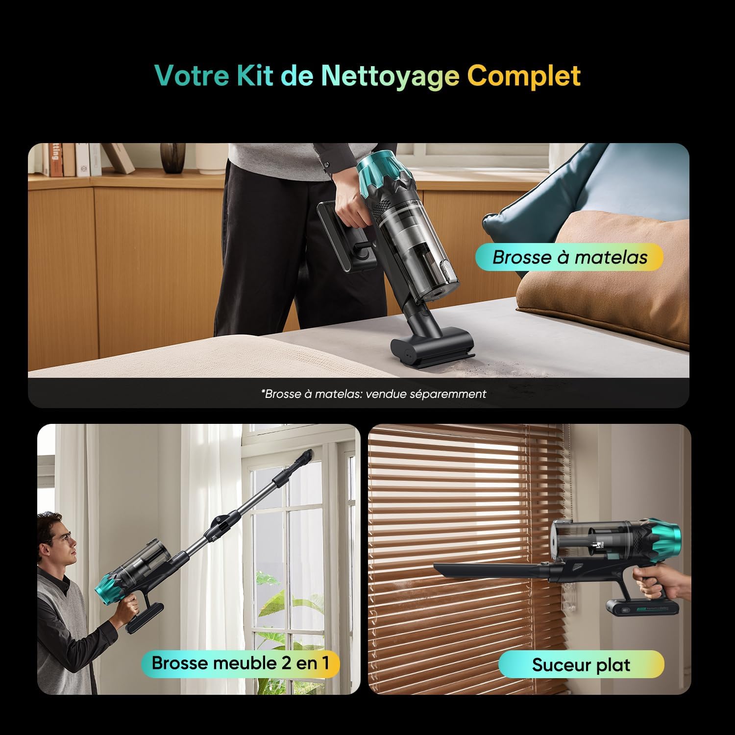 Notre ensemble comprend un corps principal, une turbo brosse, un tube télescopique flexible, un réservoir d’eau, une lavette, un filtre HEPA, une batterie, un suceur plat, une brosse meuble 2 en 1, une notice d’utilisation, un outil de nettoyage et un chargeur. Ces accessoires permettent d’adapter l’appareil à différents usages : meubles, tissus, sols durs, moquettes, surfaces élevées et intérieur de véhicule.