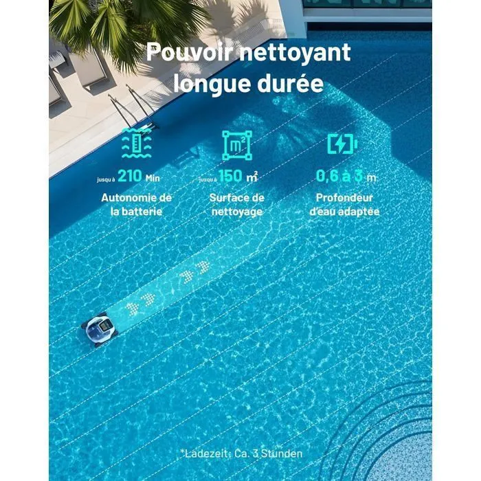 L’absence de câble d’alimentation constitue la caractéristique centrale de cet appareil. La batterie lithium de 6000 mAh permet jusqu’à 210 minutes de fonctionnement continu, soit 3,5 heures d’autonomie effective. Cette capacité couvre des bassins allant jusqu’à 150 m² sans interruption de cycle. Le temps de charge complet est de 3 heures. L’alimentation par batterie supprime toute contrainte liée à la longueur ou à l’emmêlement d’un câble, et autorise un déplacement libre dans l’intégralité du volume du bassin.