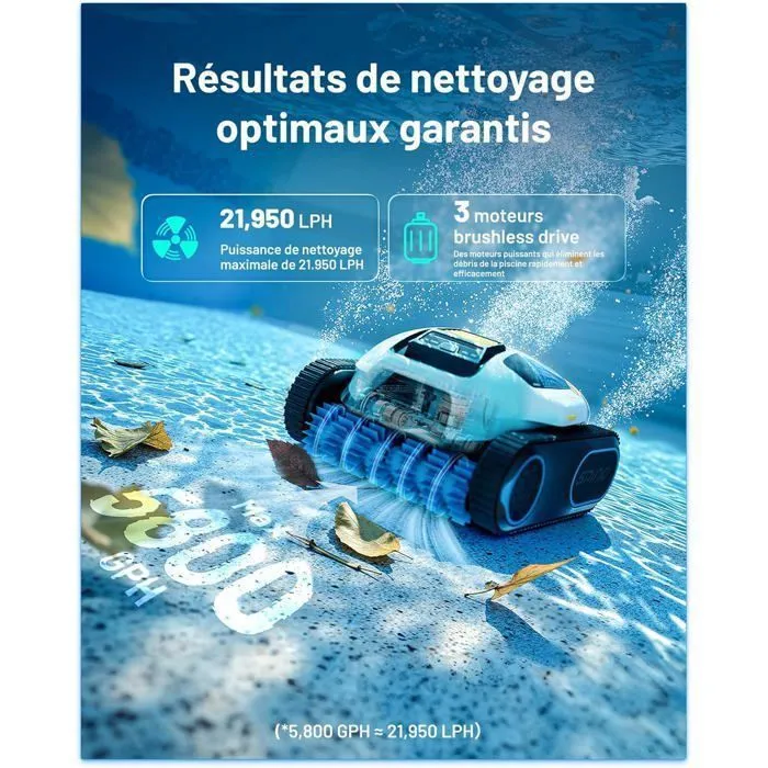 L’appareil est équipé d’un système à triple moteur sans balais, une architecture qui garantit à la fois puissance et durabilité mécanique. La puissance d’aspiration maximale atteint 5800 GPH (gallons par heure), soit un débit de 21 950 litres par heure. Ce niveau de performance permet de traiter efficacement les débris fins, les algues et les dépôts solides accumulés sur les surfaces immergées. Les moteurs sans balais présentent une longévité supérieure aux motorisations conventionnelles grâce à l’absence de pièces soumises à friction directe.