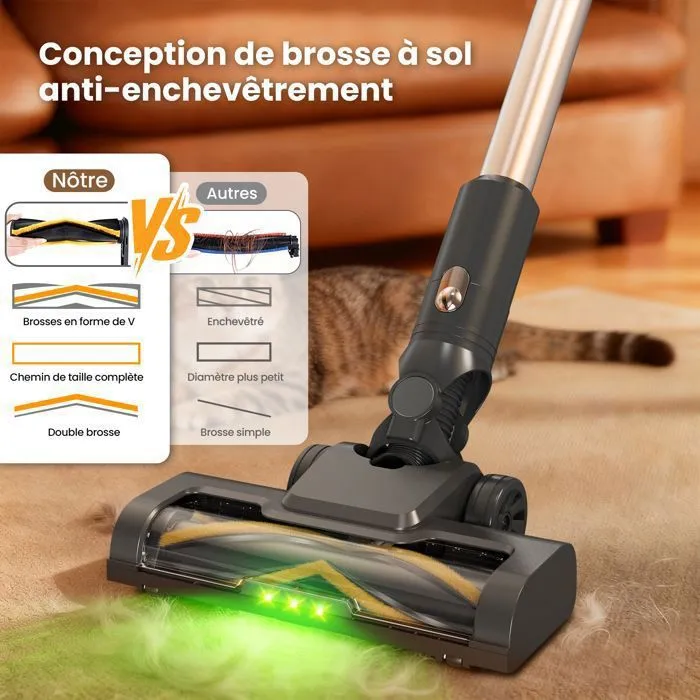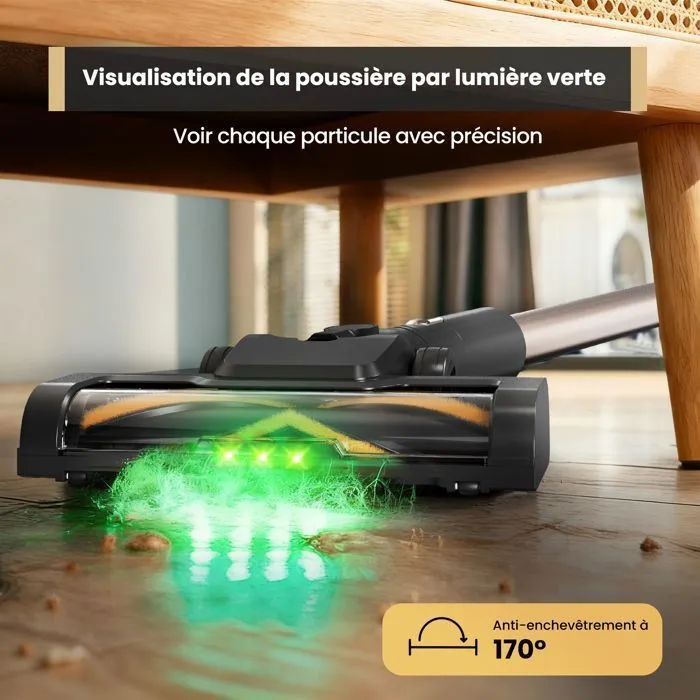La brosse de sol motorisée est équipée d’un système anti-enchevêtrement qui prévient l’accumulation de cheveux et de poils autour du rouleau. Sa largeur de récurage est de 23 cm. Une lumière LED verte intégrée à la brosse permet de détecter les particules de poussière dans les zones peu éclairées, améliorant la précision du nettoyage. Cette technologie est particulièrement utile sous les meubles ou dans les coins sombres.