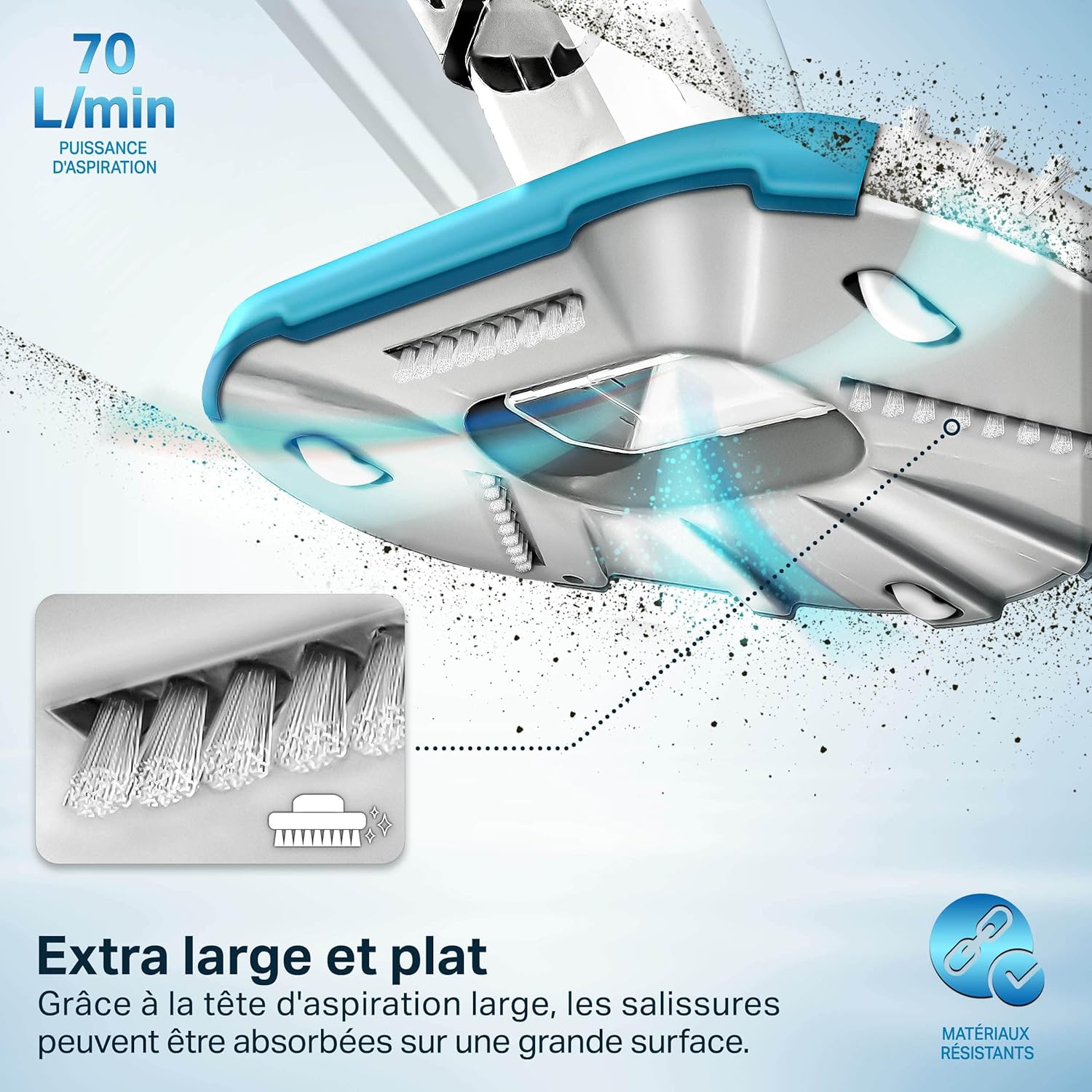 Selon la version sélectionnée, la puissance d’aspiration varie entre 70 et 120 litres par minute. Cette plage de performance permet de traiter des volumes de bassin compris entre 15 000 et 25 000 litres. Le système à deux vitesses propose un mode standard adapté à un entretien courant et un mode turbo destiné aux encrassements plus importants. Le passage d’un mode à l’autre s’effectue via un simple bouton poussoir, sans manipulation complexe. La brosse en nylon robuste intégrée à la tête assure un contact précis avec le fond et les parois, y compris dans les escaliers et les angles du bassin.