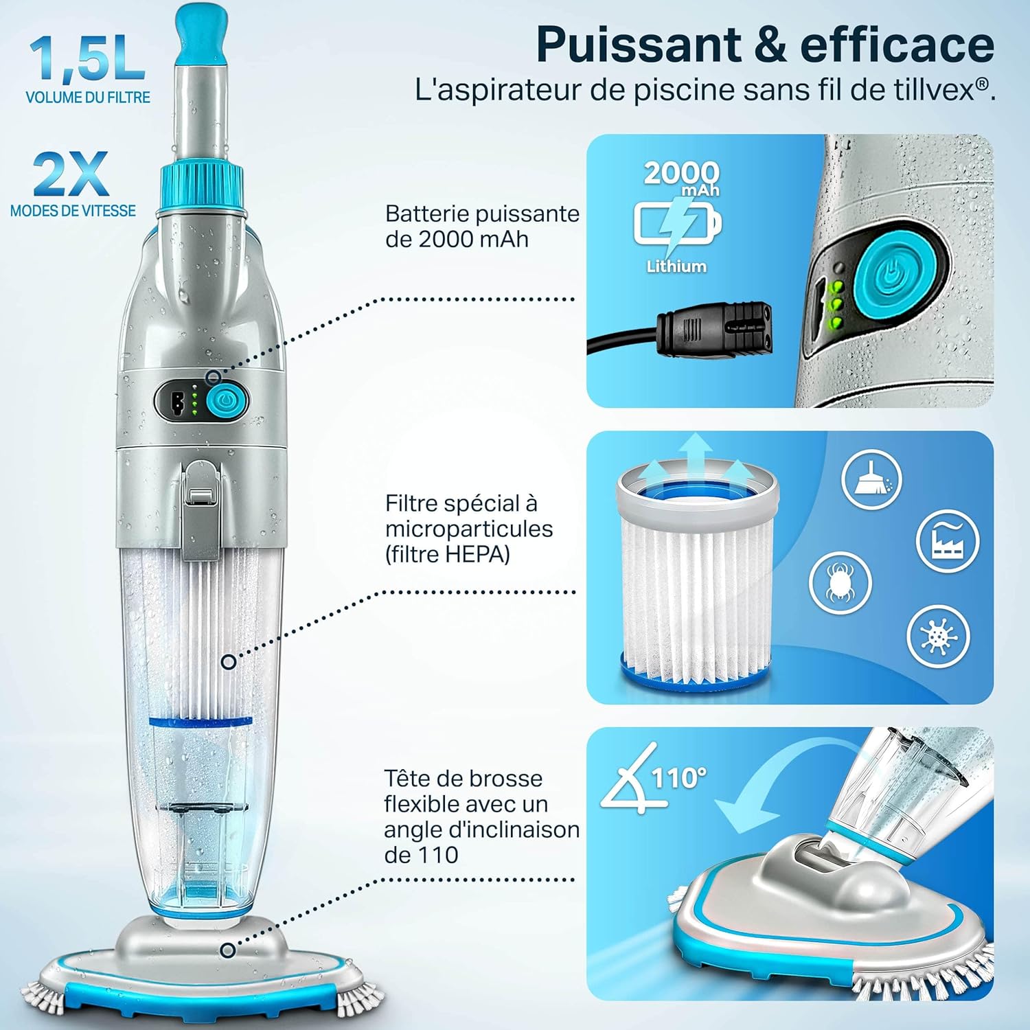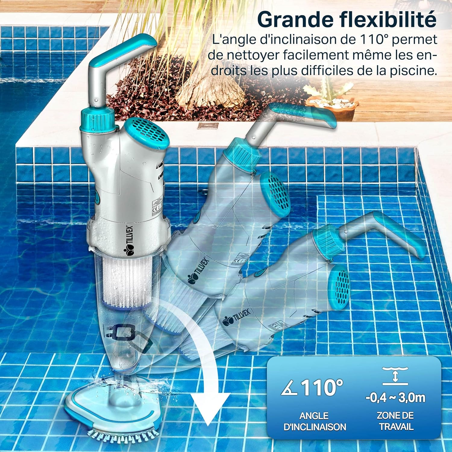 L’aspirateur piscine batterie est un équipement de nettoyage aquatique fonctionnant de manière entièrement autonome, sans raccordement électrique filaire. Il s’adresse aux propriétaires de piscines privées, spas et bassins souhaitant entretenir leur installation de façon régulière et précise. Équipé d’une batterie de 2 000 mAh, il offre une autonomie de 60 minutes par cycle de charge, ce qui lui permet d’intervenir sur des volumes d’eau allant jusqu’à 25 m³ selon la version choisie.