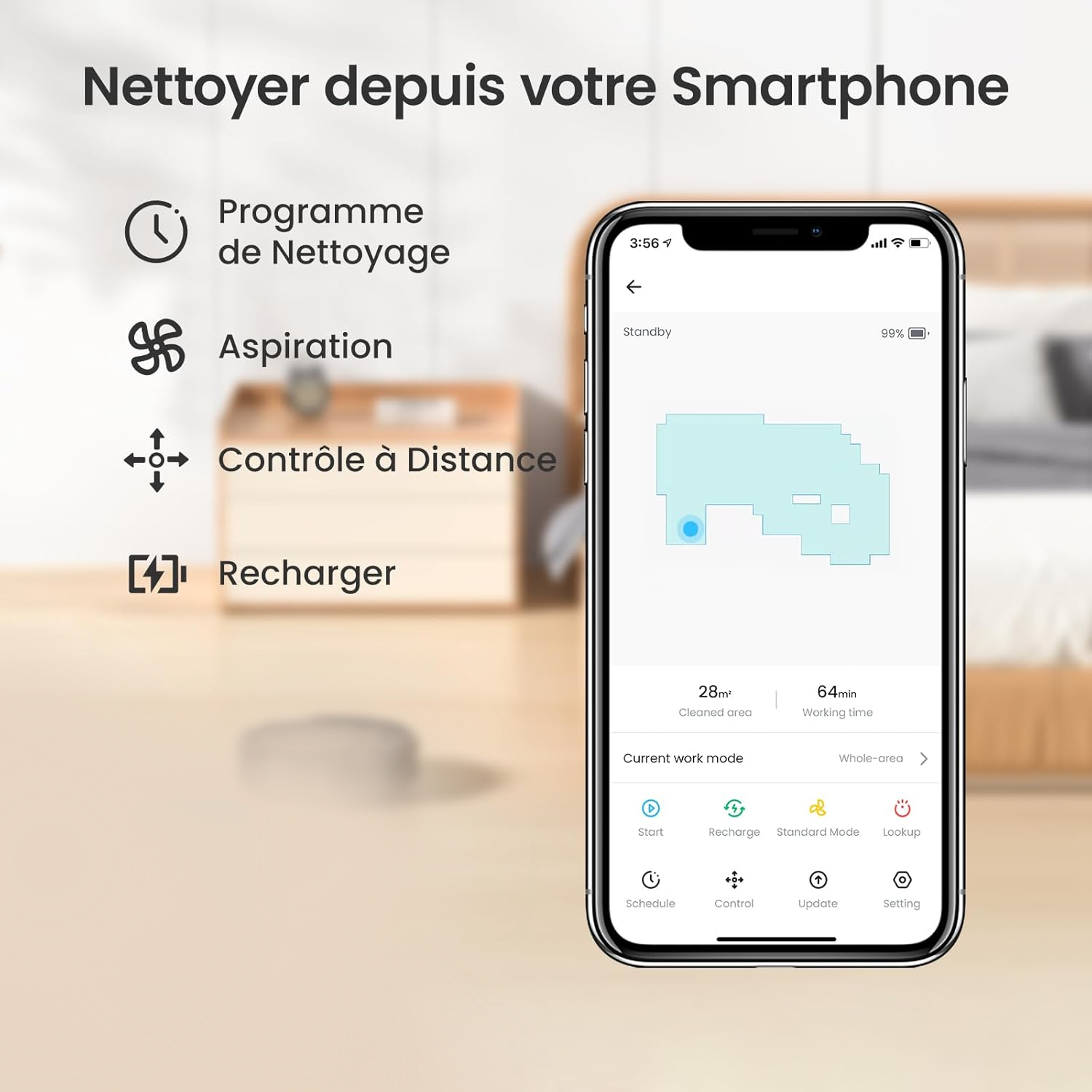 La gestion de l’appareil s’effectue via une application dédiée compatible avec les réseaux Wi-Fi 2,4 GHz et le Bluetooth pour une configuration rapide. Vous pouvez ainsi programmer des plannings de nettoyage ou piloter l’unité par commandes vocales via des assistants domestiques. L’interface logicielle permet une surveillance en temps réel de l’état du système et offre un contrôle manuel précis si nécessaire.