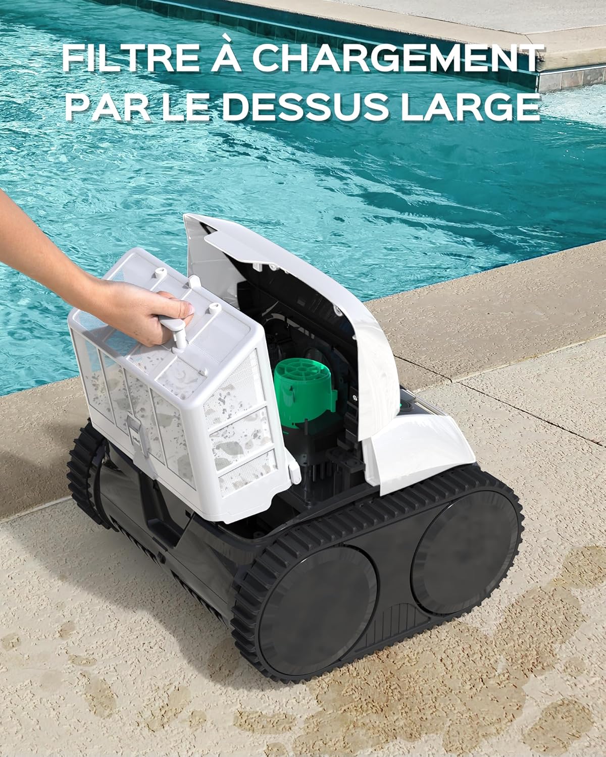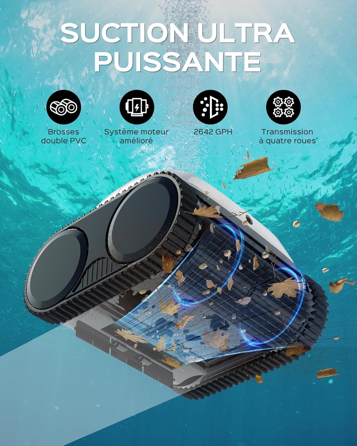 Le système de propulsion repose sur une traction 4×4 robuste capable de maintenir l’appareil contre les parois les plus lisses. Pour une piscine creusée, la gestion des inclinaisons est cruciale, c’est pourquoi ce robot utilise un gyroscope intelligent pour stabiliser sa trajectoire. Les brosses PVC assurent une friction constante sur le revêtement, tandis que la navigation en N et en S optimise le temps de passage sur chaque mètre carré de votre surface immergée.