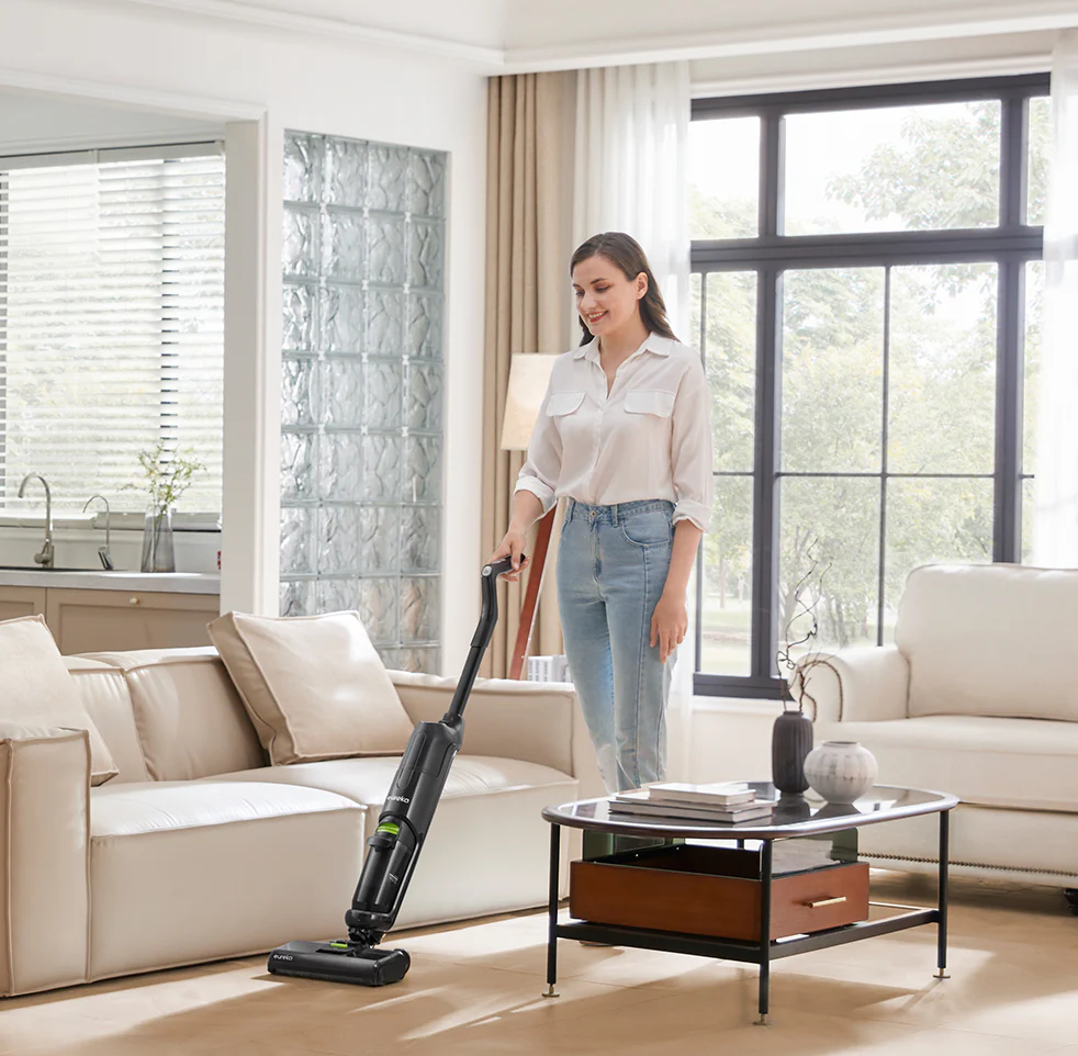 L’appareil pèse 3,95 kg, ce qui le positionne dans la catégorie des aspirateurs laveurs légers. Son système autopropulsé réduit l’effort physique lors des passages. La tête pivotante et flexible permet d’atteindre les zones sous les meubles et dans les recoins sans repositionner l’ensemble de l’appareil. Le design compact facilite le rangement sur la base fournie.