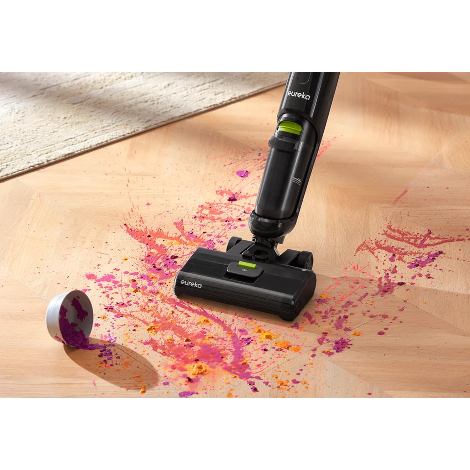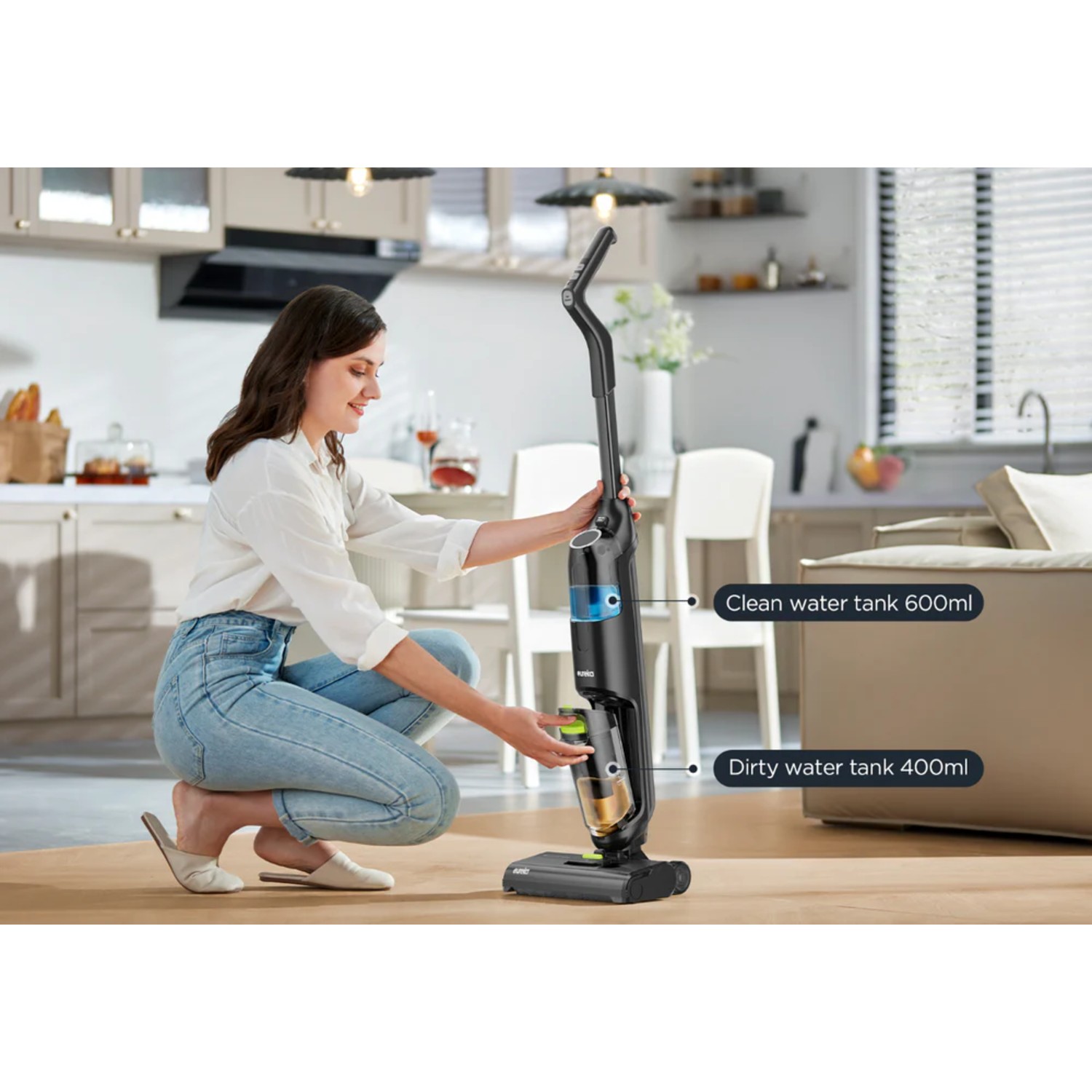 Ce Nettoyeur de Sol Sans Fil réunit dans un format compact les fonctions d’aspiration, de lavage et d’autonettoyage, avec une autonomie de 30 minutes sur batterie, un double réservoir de 600 et 400 ml, et une compatibilité exclusive avec les sols durs.