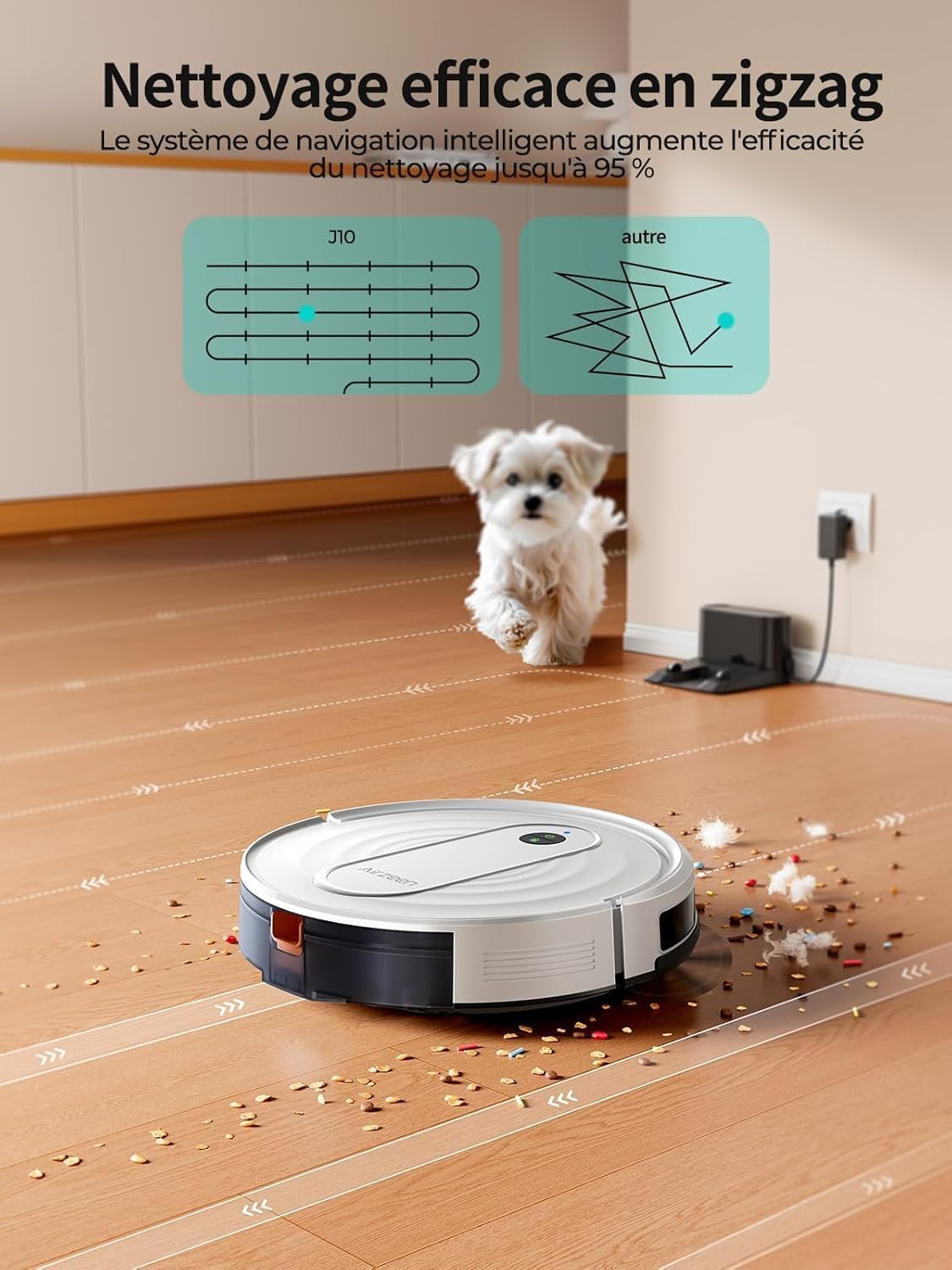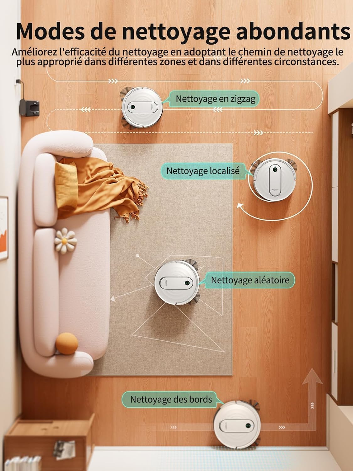 La technologie Smart Carpet Booster permet à notre équipement de modifier son comportement dès qu’il identifie un changement de texture au sol. En détectant un tapis, le système augmente instantanément sa force de succion pour déloger les saletés incrustées. Cette adaptation en temps réel garantit que les fibres reçoivent un traitement spécifique, tandis que les capteurs anti-collision protègent votre mobilier pendant cette phase de nettoyage intensif.